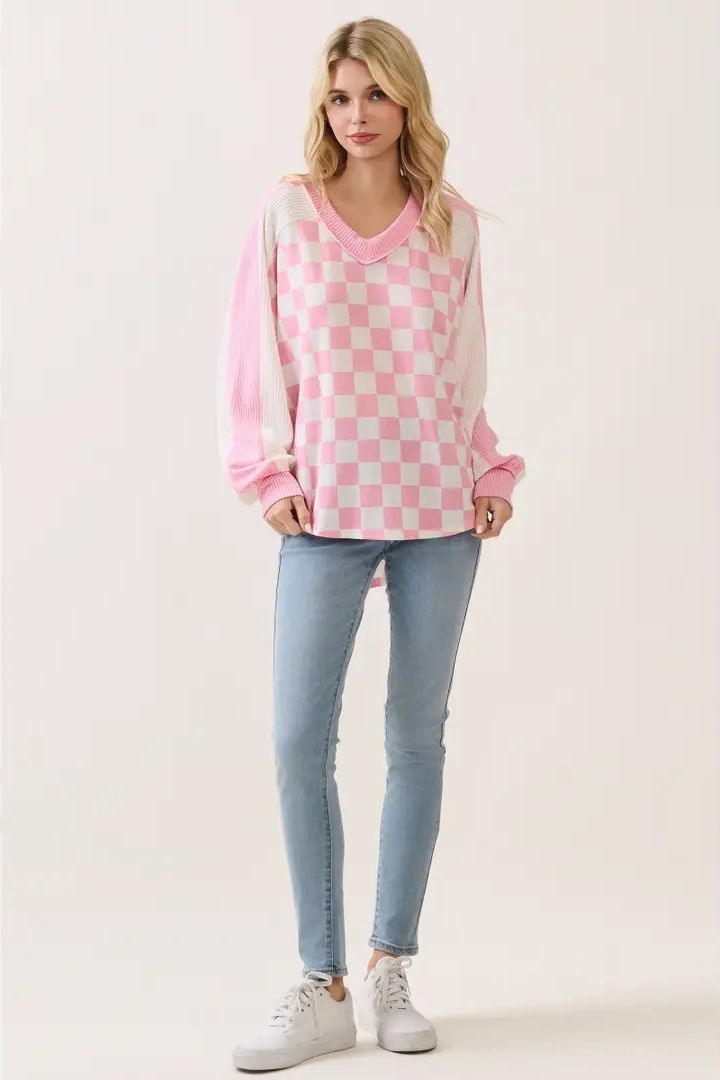 Checkered Print V Neck Pullover Top